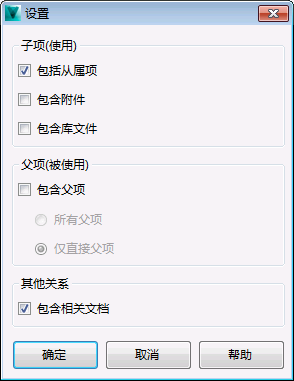 该“设置”功能使您可以配置关系、附件和提取配置。可在执行特定 Vault 操作(例如“检入”、“更改状态”和“打包”)期间显示的对话框上访问该“设置”功能。