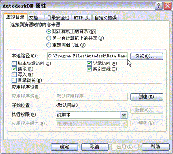 - 在“AutodeskDM 属性”对话框中,单击“虚拟目录”选项卡,然后查看“本地路径”。