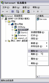 - 在“Internet 信息服务”对话框中,在“AutodeskDM”上单击鼠标右键,然后选择“删除”。