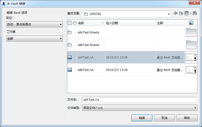 您可以在“从 Vault 链接文件”对话框中选择要链接到当前 Revit 项目的 Vault 中的文件。