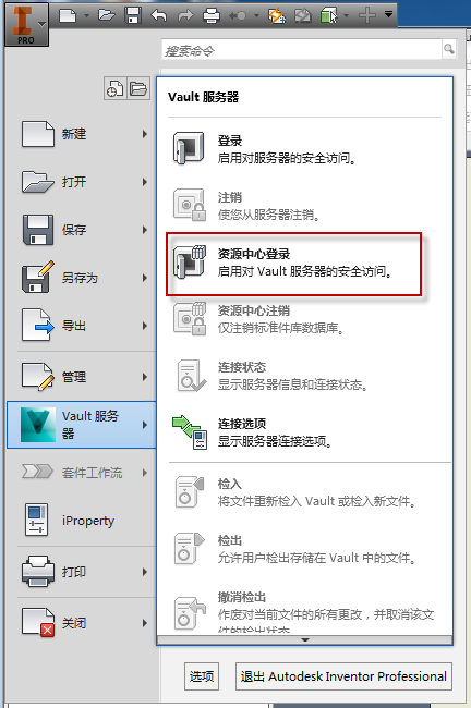 在 Vault 功能区上选择“登录”,以登录 Autodesk Data Management Server。