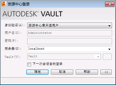 注: 如果您当前未使用 Autodesk Vault,但需要访问资源中心库来查找库零件或特征并将其装入文档,请选择“资源中心库只读用户”以继续。