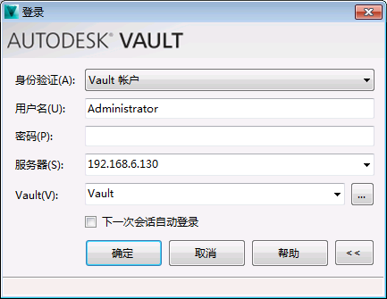 如果未使用 Windows 身份验证,则必须拥有一个有效的 Autodesk Vault Server 帐户。