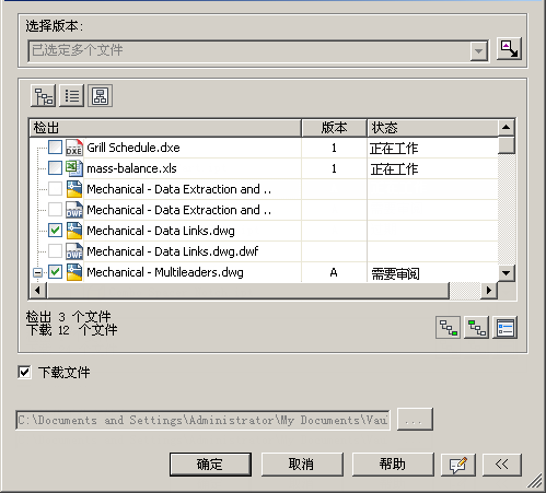 Autodesk Vault Professional 2013 中多个文件的“获取/检出”对话框