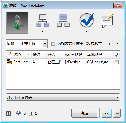 根据 Autodesk Vault 的版本,“获取/检出”对话框会包含不同的选项。此外,某些附加模块具有不同于单机版客户端的工作流。在该部分中将列出从 Vault 中检出文件的不同工作流。
