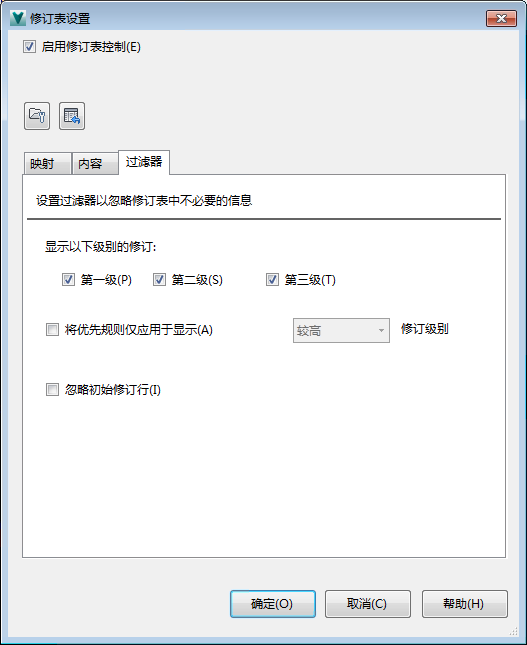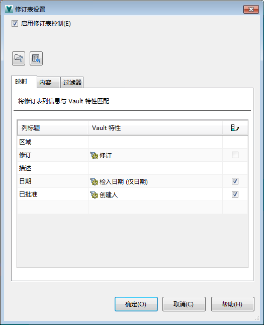 在“修订表设置”对话框中,您可以配置数据显示方式、哪些 Vault 特性映射到修订表和显示的内容类型。您还可以使用过滤器,以便在修订表中只显示所需信息。