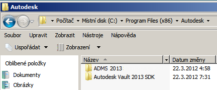 - v případě, že používáte 64bitový operační systém, do umístění C:\Program Files (x86) \Autodesk\ADMS (verze produktu) 2012\SDK.
