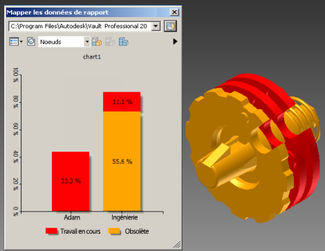 Par exemple, un secteur du graphique circulaire peut indiquer qu'un pourcentage important des fichiers est à l'état Travail en cours. Cependant, lors du mappage des données sur le modèle, seul un petit nombre de fichiers est identifié par des couleurs pour la section Travail en cours. Cette différence est due au fait que le secteur prend en compte les fichiers attachés ainsi que les fichiers pièce, et que seuls les fichiers pièce sont visibles sur le canevas. Vous pouvez afficher le rapport complet pour consulter la liste complète des fichiers qui constituent un secteur du graphique circulaire.