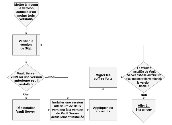 Si des versions de serveur intermédiaires sont requises, seul le premier serveur est concerné. Tous les autres serveurs Vault répartis dans tous les groupes de travail doivent installer la dernière version du serveur Vault, des Service Packs et des correctifs, et ignorer les versions intermédiaires.