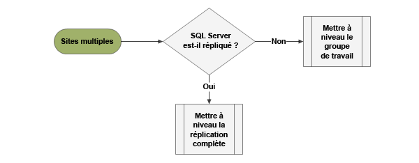 Nous vous recommandons de commencer par le site dont la connexion au serveur SQL est la plus rapide. Lorsque vous êtes prêt à effectuer la mise à niveau, suivez les étapes décrites dans la section Site unique. Mettez à niveau le serveur sélectionné vers la dernière version et le dernier Service Pack avant de passer sur d'autres sites.