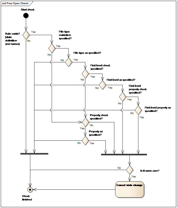 The check is applied during a state change on a document. It contains a control whether the current user is the same user who has executed the previous state change. It contains two parts: Pre-check and User Check.