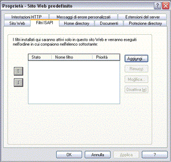 - Nella finestra di dialogo delle proprietà del sito Web predefinito, fare clic sulla scheda Filtri ISAPI.