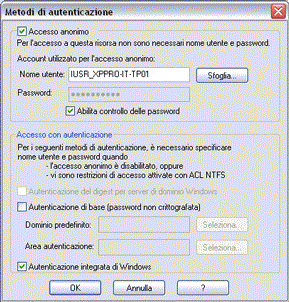 - Nella finestra di dialogo Metodi di autenticazione viene visualizzato il nome utente dell'account anonimo utilizzato da IIS. Verificare che tale account esista sul server.