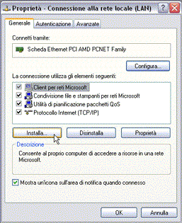 - Nella finestra di dialogo relativa alle proprietà della connessione alla rete locale, fare clic su Installa.