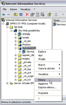 - Nella finestra di dialogo Internet Information Services, fare clic con il pulsante destro del mouse su AutodeskDM e selezionare Elimina.