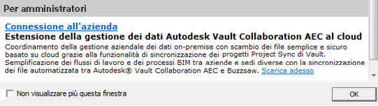 È possibile installare Project Sync dall'applicazione Buzzsaw. Se si esegue il login mediante il client principale o il client Web, viene visualizzata la finestra di dialogo Nuove funzionalità. Nella sezione Connessione a Enterprise, nella parte inferiore della finestra di dialogo Nuove funzionalità, sono disponibili i dettagli e il download della funzionalità. Fare clic sul collegamento Scarica ora, estrarre i file e installare Project Sync.