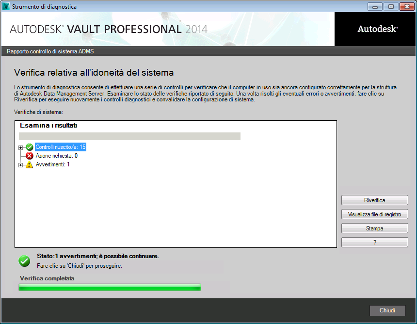 Il processo di installazione del Vault esegue un'analisi diagnostica del sistema prima di procedere con l'installazione. Effettuare una delle seguenti operazioni nella schermata Rapporto controllo di sistema ADMS: