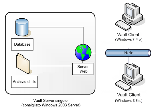 È possibile impostare l'archivio di file del Vault in un computer remoto. Per l'utilizzo di un archivio di file remoto è richiesta la configurazione di privilegi e account appropriati. Il Vault supporta due configurazioni di base dell'archivio di file:
