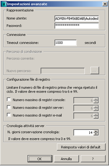 - Nella finestra di dialogo Impostazioni avanzate, modificare il nome utente in MyDomain\AutodeskRemote, quindi immettere la password corrispondente.