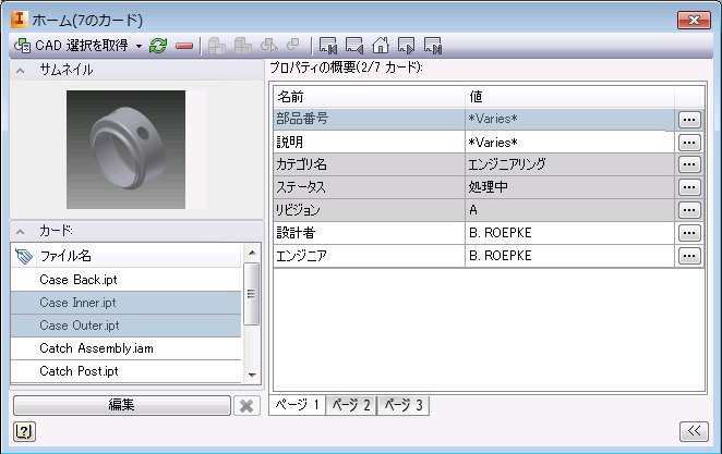 プロパティ グリッドは、[編集]ボタンをクリックして編集モードに変更できます。編集モードでは、ファイルが自動的に Vault からチェックアウトされて、表示されたプロパティ値を編集できます。編集が終了したら、新しい値をローカル ファイルやサーバ ファイルへ書き込むことができます。この編集は、ファイルを Vault にチェックインすると、無期限に保存されます。個々のカードで実行した操作はすべて、そのカードに関連するコンポーネントのみに反映されます。