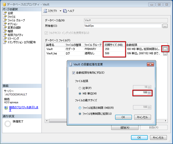 - すべての <Vault> データベースの[自動拡張]を、最大 100 MB、拡張制限なしに設定する。
