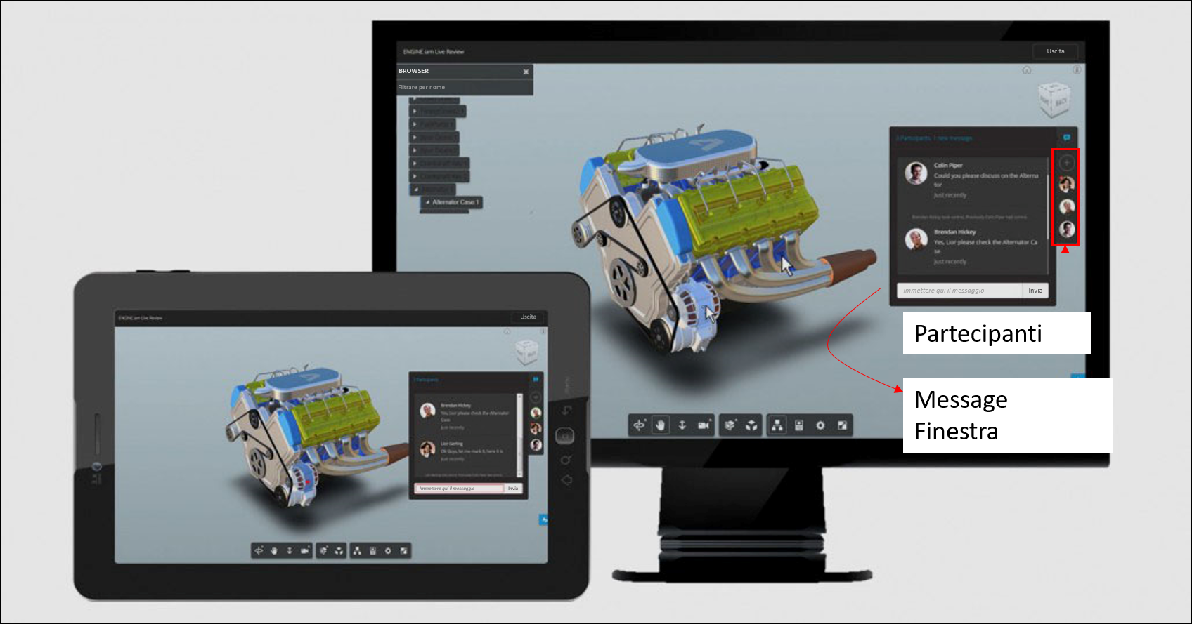 I partecipanti comunicano tramite la funzionalità della chat. Attualmente, tutti gli strumenti del visualizzatore di A360, ad eccezione degli strumenti Revisione e Commenti, sono disponibili durante una sessione di Revisione in tempo reale.