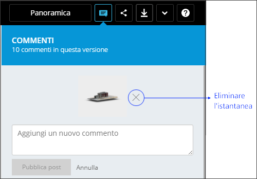 Quando si aggiunge un commento, un'istantanea della vista del progetto viene aggiunta automaticamente al commento. È possibile regolare la vista del progetto prima di pubblicare il commento. Se non si desidera includere l'istantanea come parte del commento, è possibile eliminarla.