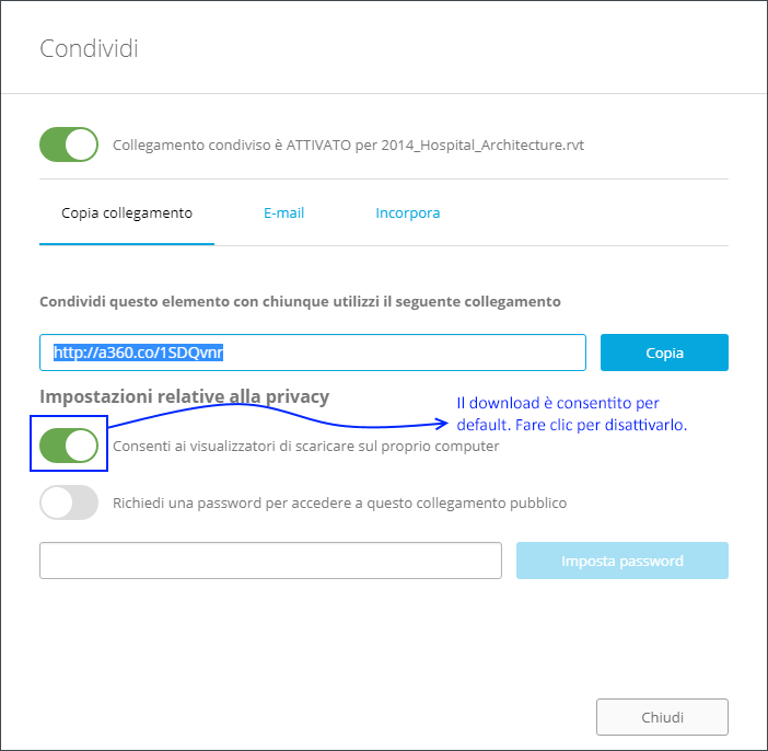 Per default, l'opzione di download è attivata per i collegamenti condivisi, ma è possibile disattivarla. Inoltre, è possibile impostare una password per il file.