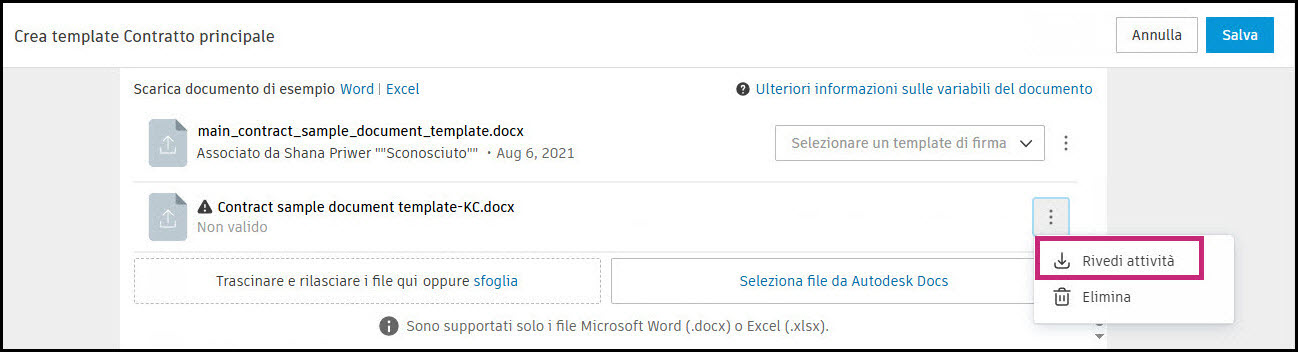 Selezionare Scarica documento di esempio per scaricare un template di Word o Excel personalizzabile. Lavorare da un file Microsoft Word o Excel e aggiungere le variabili necessarie. Maggiori informazioni sulle variabili disponibili per i documenti.