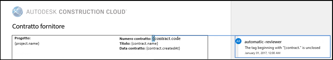 Il template di documento viene avviato durante il download. Aprire il template di documento scaricato. Accanto alle variabili non valide vengono visualizzati dei commenti.