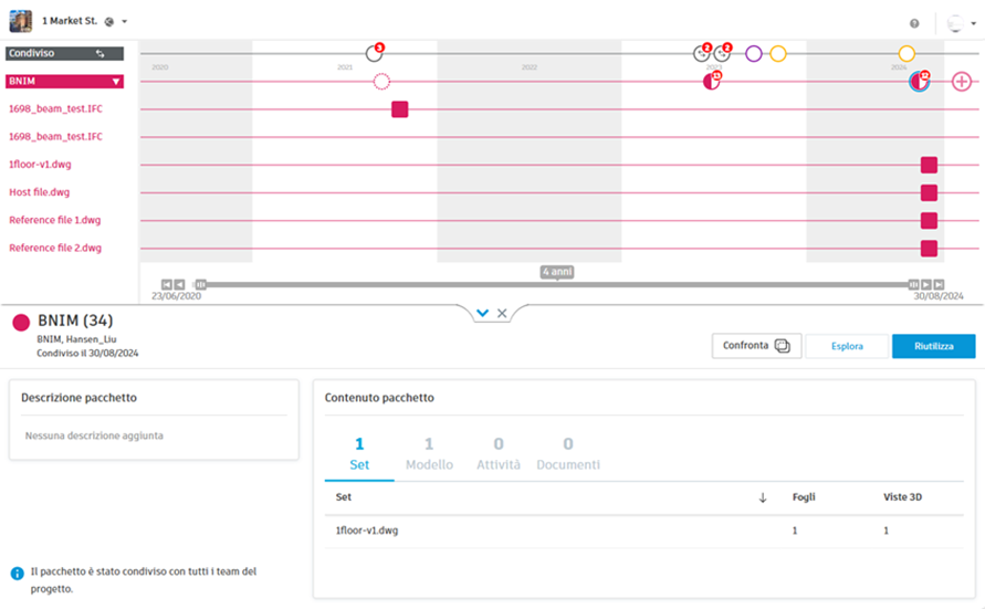 I nuovi elementi condivisi del pacchetto vengono visualizzati nel visualizzatore nel contesto del modello di progetto aggregato. Utilizzate le opzioni del pannello per filtrare per team, fasi e livelli o per visualizzare un elenco di gruppi, modelli e documenti del pacchetto. Per ulteriori informazioni, vedere Modello di progetto aggregato.