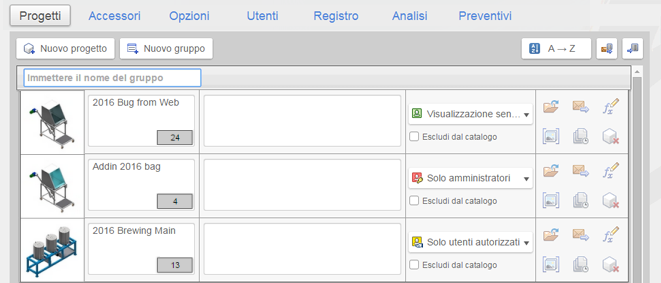 Nella scheda Progetti viene visualizzata la Vista amministratore. La Vista amministratore fornisce l'accesso a tutte le funzioni di Configurator 360.