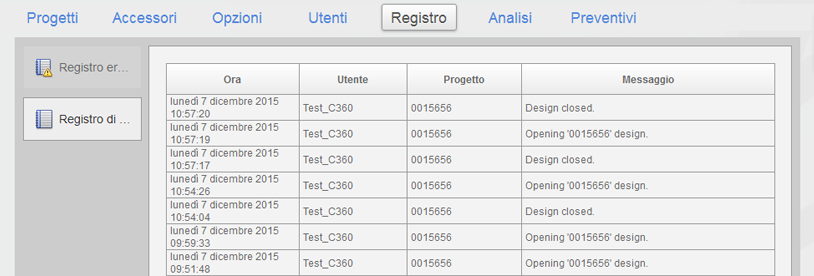 In questa scheda viene visualizzato un elenco di tutte le azioni eseguite dai clienti e gli eventuali errori che si sono verificati.