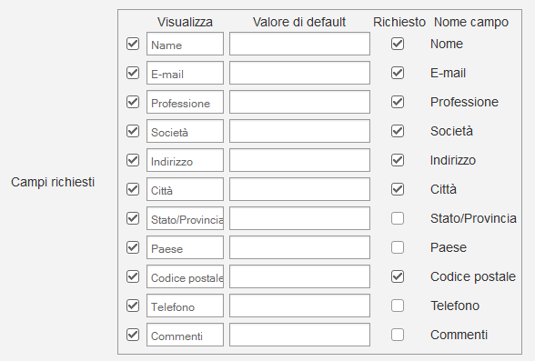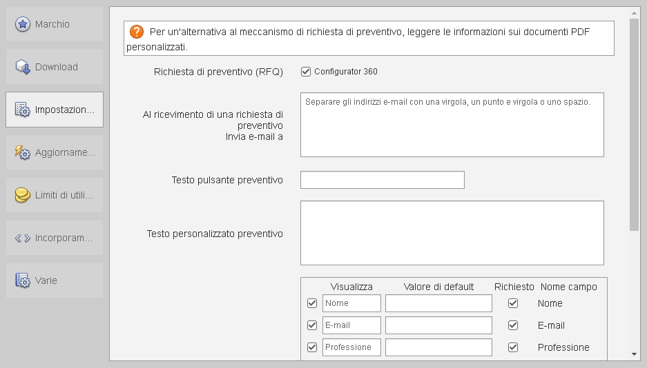 Consente di controllare i campi visualizzati dal cliente quando viene selezionato il pulsante dei preventivi.