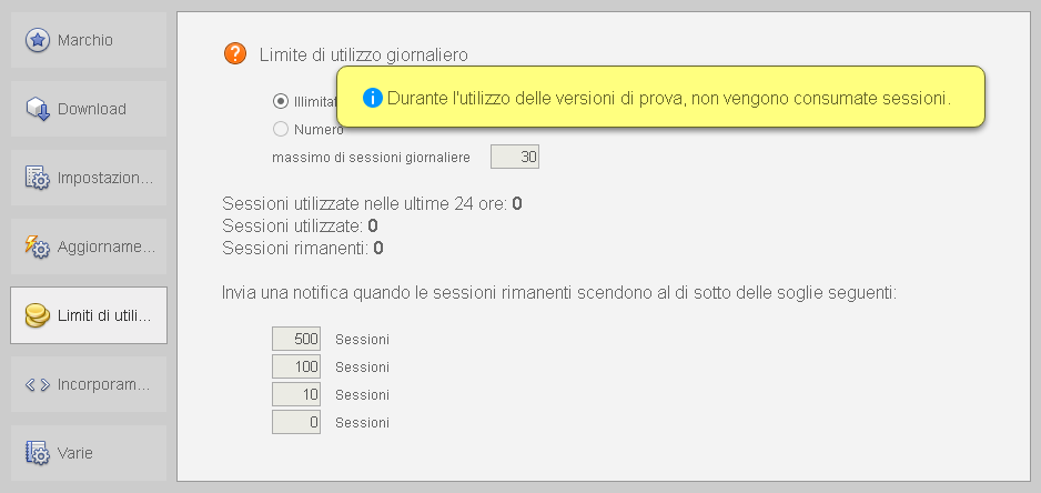 - Per gestire l'utilizzo, specificare il numero massimo di sessioni che gli utenti finali possono utilizzare al giorno (un periodo di 24 ore consecutive).