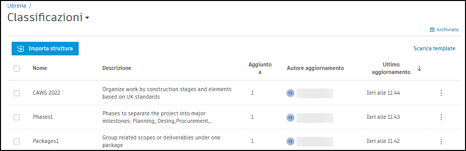Verrà visualizzato l'elenco delle strutture di classificazione disponibili per l'utilizzo nei progetti nell'account. Facendo clic su un elemento nell'elenco si aprirà tale struttura.