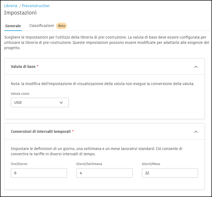 Configurare le impostazioni generali per la valuta di base e la conversione dii intervallo temporale, nonché assegnare classificazioni alla libreria di pre-costruzione nelle impostazioni della libreria di pre-costruzione. Gli amministratori dell'account possono accedere a questi impostazioni facendo clic sul collegamento Impostazioni nella pagina della libreria di pre-costruzione.