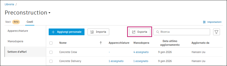 Come esportare i costi dalla libreria di pre-costruzione:
