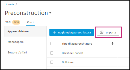 Gli amministratori dell'account possono impostare i costi nella libreria dell'account nella libreria in Account Administration immettendo i costi uno alla volta nella libreria dei costi di pre-costruzione o importando un file XLSX con più costi nella libreria. È inoltre possibile esportare i costi della libreria dalla libreria in un file XLSX.