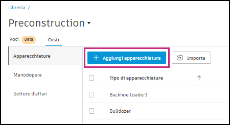 - Selezionare Apparecchiature, Manodopera o Personale nella barra di navigazione Costi a sinistra.