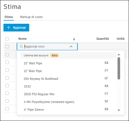 Quando si aggiungono voci in Stima, fare clic sul campo Nome in una riga della tabella di stima e iniziare a digitare un nome di voce per cercare una voce della libreria.