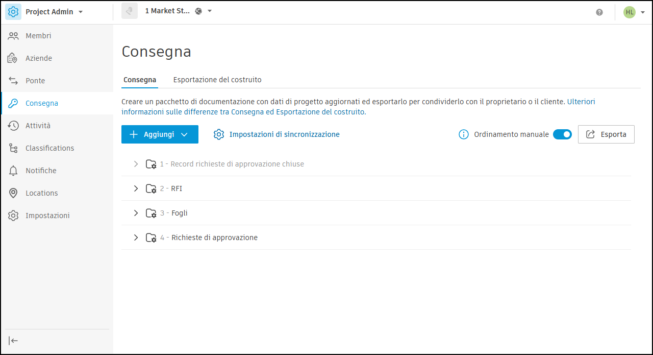 Consegna è uno strumento di assemblaggio dei pacchetti all'interno di Project Admin. È un luogo in cui assemblare, raccogliere e organizzare la documentazione di consegna che viene esportata e condivisa con il proprietario o il cliente.
