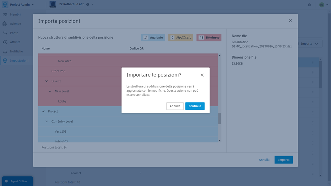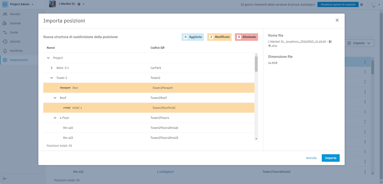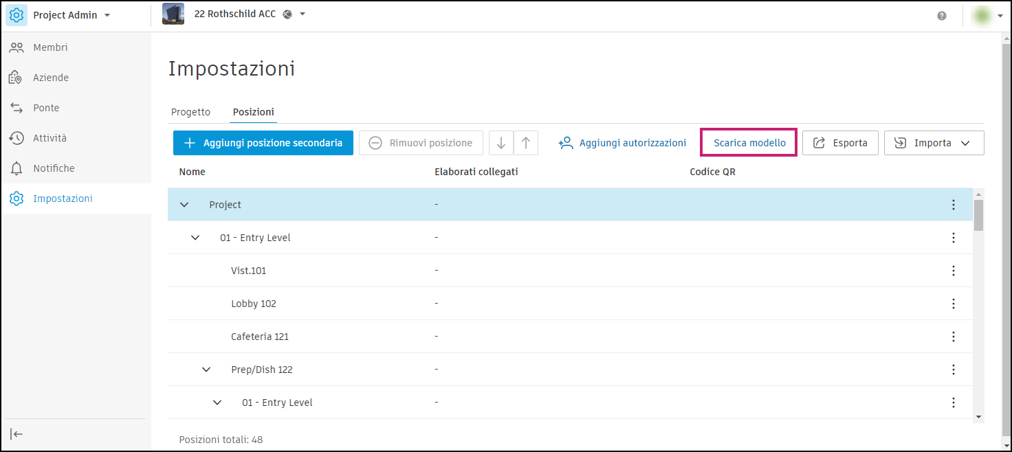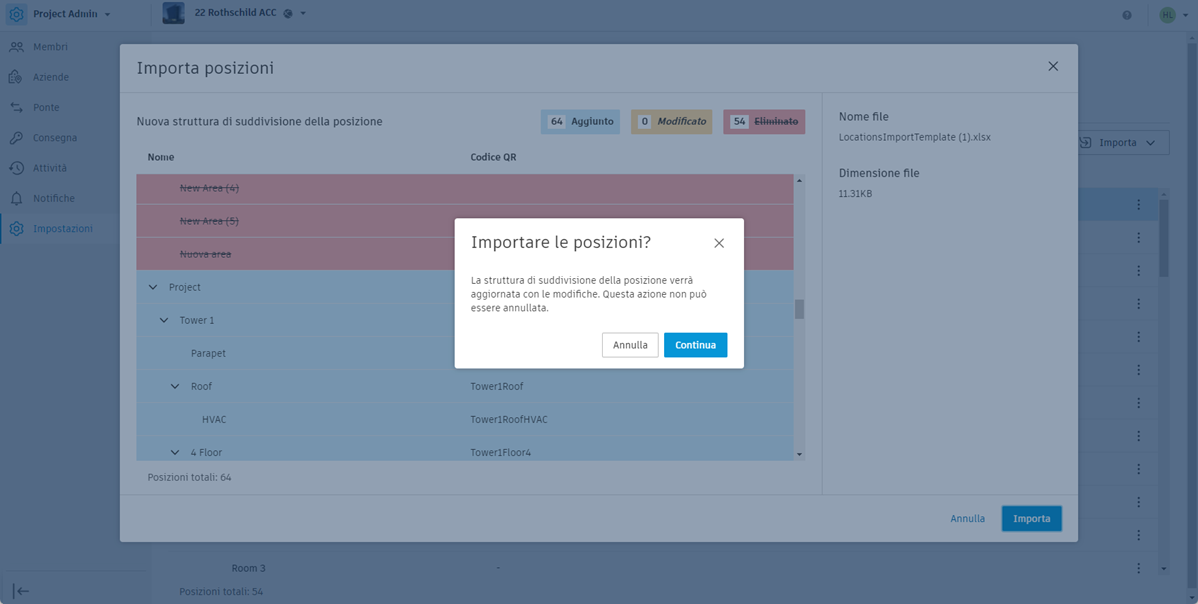 Le posizioni devono essere formattate correttamente per poter essere importate. In un nuovo progetto, un processo tipico consiste nello scaricare il template di foglio di calcolo, inserire le posizioni in linea con la guida e importare il foglio di calcolo completato. È quindi possibile aggiungere, rimuovere o spostare manualmente le posizioni come desiderato o esportare la struttura di suddivisione della posizione attuale, apportare eventuali modifiche e importare nuovamente il foglio di calcolo.