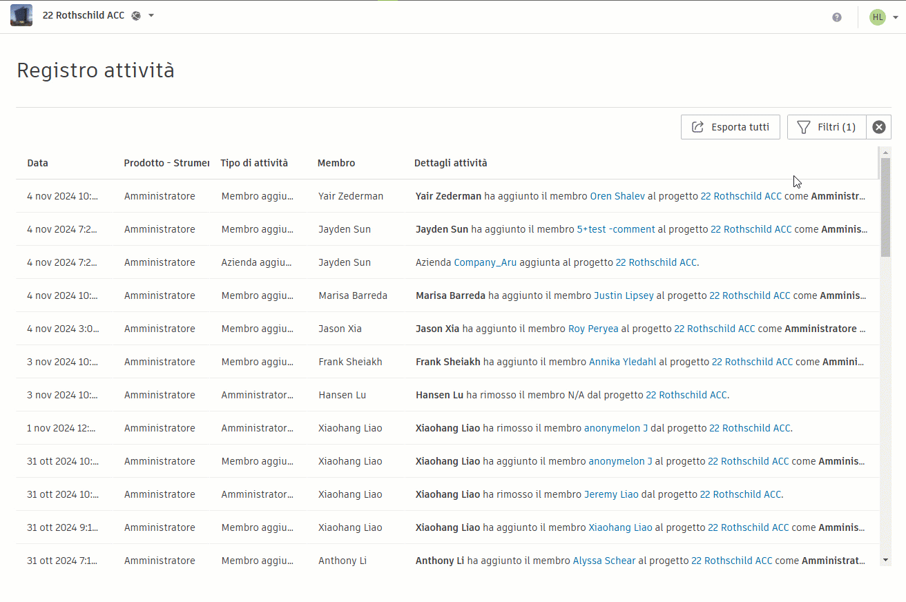 È possibile esportare tutti i dati o i dati dell'attività filtrati.