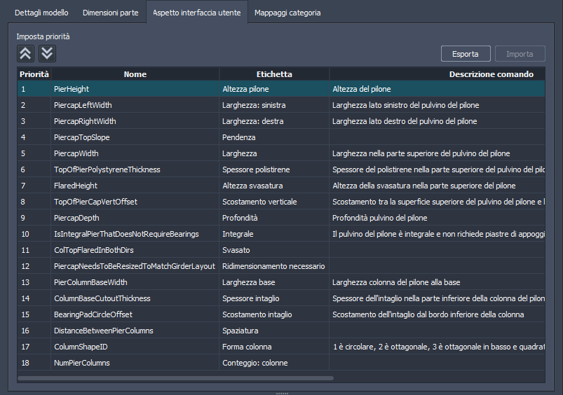 Aspetto interfaccia utente: quando si aggiungono o si modificano i componenti del ponte parametrici, i segmenti del tunnel o le finiture stradali nella scheda Modelli parametrici della Tavolozza stili, è possibile utilizzare la scheda Aspetto interfaccia utente della finestra di dialogo Configura modelli parametrici per personalizzare il modo in cui gli attributi dei componenti parametrici vengono visualizzati nella pila.