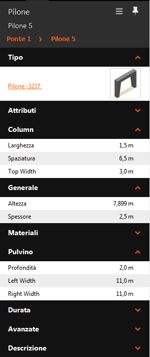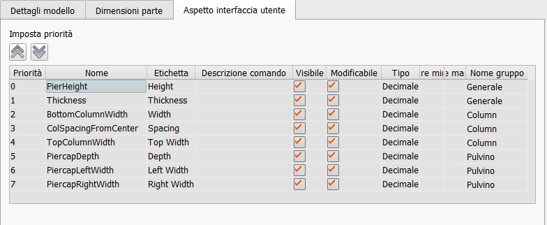 Nome gruppo: fare doppio clic sul valore Nome gruppo e immettere del testo per definire dove vengono visualizzati gli attributi della quota chiave nella pila. Nella maggior parte dei casi, si utilizzerà il campo Priorità insieme con il campo Nome gruppo, in modo da poter categorizzare gli attributi nella pila per soddisfare le proprie esigenze del progetto. Ad esempio, le quote chiave per un componente parametrico Pilone possono essere categorizzate negli attributi Generale, Colonna e Pulvino nella pila utilizzando i campi Nome gruppo e Priorità, come mostrato di seguito.
