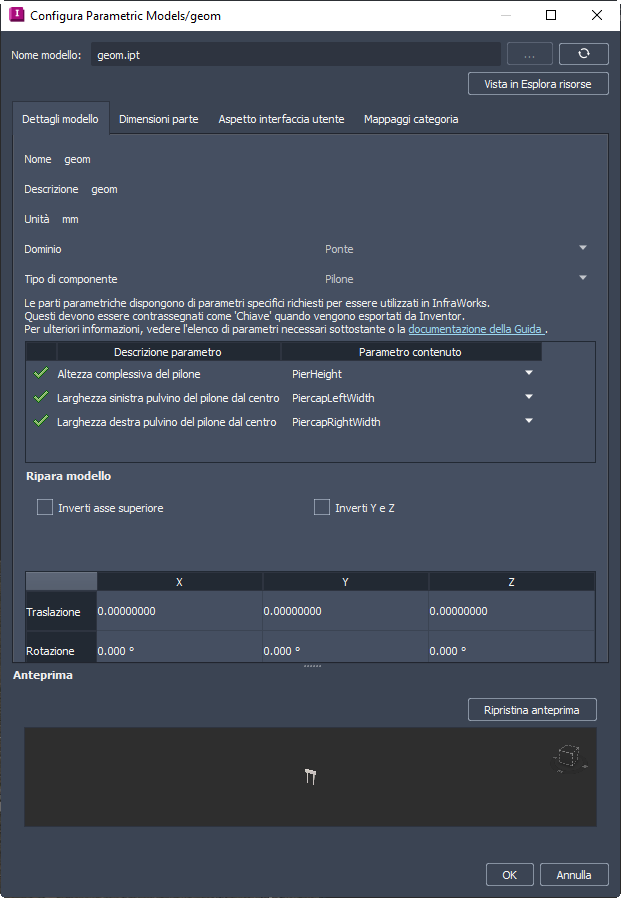 Per modificare Dimensioni parte, Aspetto interfaccia utente o Mappaggio categorie di Revit per il modello parametrico, vedere Come modificare i componenti del ponte o del tunnel parametrici.