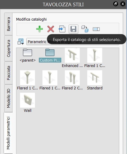 È possibile esportare cataloghi di stili dalla scheda Modelli parametrici della Tavolozza stili per condividere i componenti parametrici con altri utenti di InfraWorks.