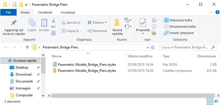 È possibile condividere il catalogo di stili con altri utenti condividendo direttamente il file .STYLES.JSON e la cartella ZIP. Quando un utente dispone del file .STYLES.JSON e ZIP sul suo sistema locale, può importare il catalogo di stili nei relativi modelli. Per ulteriori informazioni, vedere Gestione di stili e cataloghi di stili.