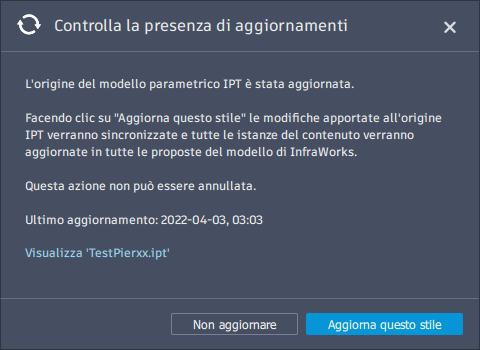 Controlla la presenza di aggiornamenti. Il file di origine dello stile verrà controllato per determinare se è stato aggiornato. Se il file è stato aggiornato, viene visualizzata una finestra con l'opzione per aggiornare tutte le istanze dello stile utilizzate nelle proposte del modello di InfraWorks.